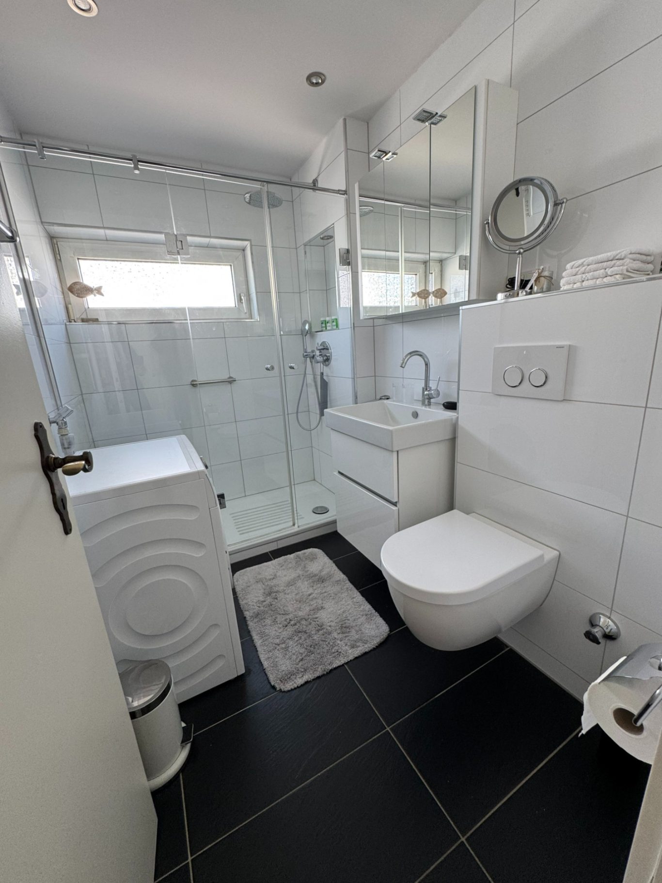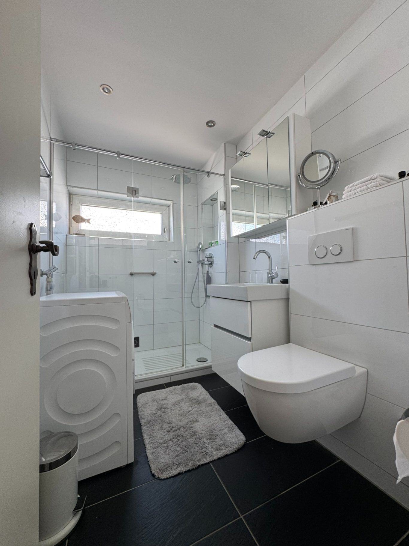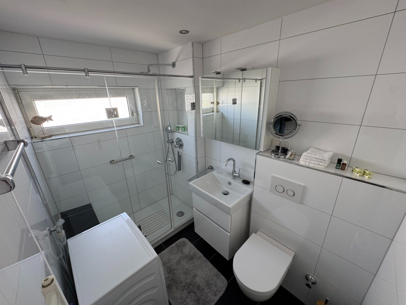 In unserer modernen Ferienwohnung erwartet Dich ein Badezimmer, das keine Wünsche offenlässt. Es ist hell und einladend gestaltet und bietet viel Stauraum für all deine Utensilien. Das Tageslichtbad sorgt für eine angenehme Atmosphäre, während das Hänge - WC und die begehbare Dusche dem Raum eine zeitgemäße Note verleihen.  Komfort und Funktionalität stehen im Mittelpunkt dieses durchdachten Designs.